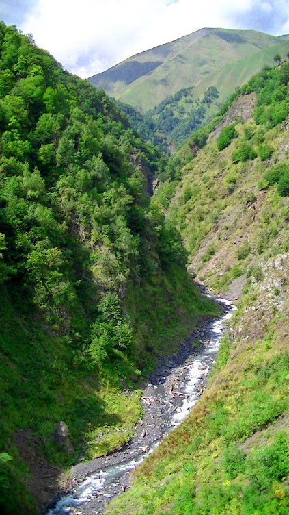 Контрольная точка, съезд с трассы, едем по долине вдоль небольшой речушки. Проезжаем несколько сел. Дорога асфальтирована. В одном из сел, вроде бы родился нынешний грузинский Патриарх.За селом дорога плавно уходит влево в горы. Это ― первый наш опыт езды по горным грузинским дорогам. Тренируемся, привыкаем. Дорога идет вверх, далеко внизу ущелье с рекой. Красиво. Непривычно.